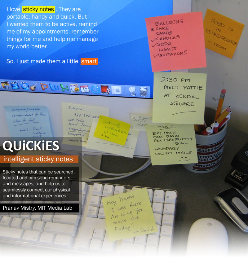 P. Mistry, P. Maes. Quickies: Intelligent Sticky Notes. In the Proceedings of 4th International Conference on Intelligent Environments (IE08). Seattle, USA. 2008 P. Mistry, P. Maes. Intelligent Sticky Notes that can be Searched, Located and can Send Reminders and Messages. Proceedings of the ACM International Conference on Intelligent User Interfaces (IUI2008). Canary Islands, Spain. 2008. P. Mistry. Quickies: Intelligent sticky notes. 2008 video (wmv) Watch Quickies Video at YouTube Watch Quickies Video at ZDNET NEWS |